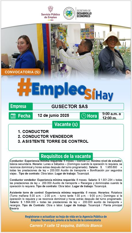 Si cuentas con el perfil, como CONDUCTOR, CONDUCTOR VENDEDOR Y ASISTENTE TORRE DE CONTROL y cumples con los requisitos mencionados, no dudes en asistir el día 12 de Junio del 2025 a la agencia de servicio público de empleo de Tocancipá (edificio blanco) con tu hoja de vida actualizada, copia del documento de identidad y certificados laborales. ¡Te esperamos! No olvides actualizar tu hoja de vida en la agencia pública de empleo previo a la fecha de la convocatoria.