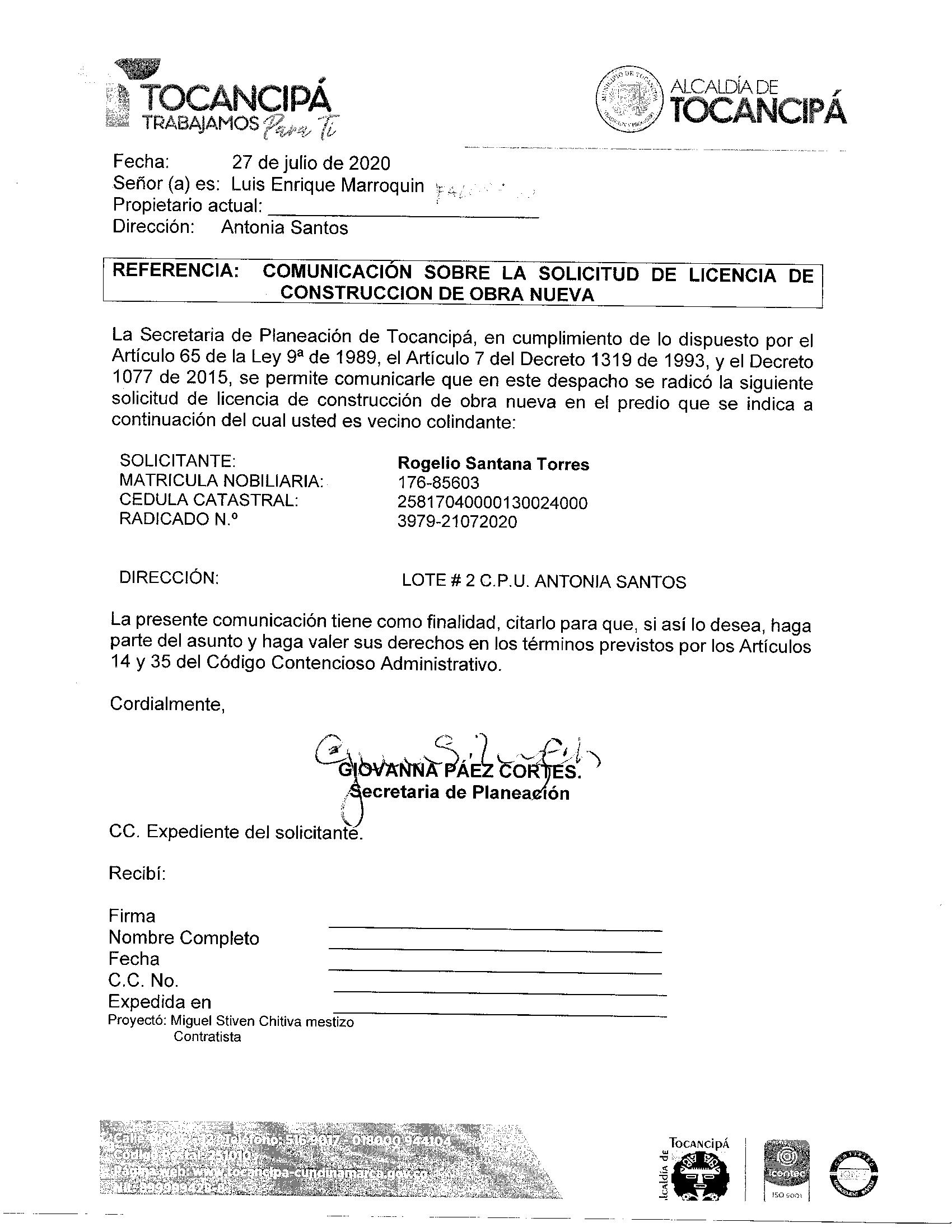 “COMUNICACIÓN SOBRE LA SOLICITUD DE LICENCIA DE CONSTRUCCIÓN MODALIDAD OBRA NUEVA”