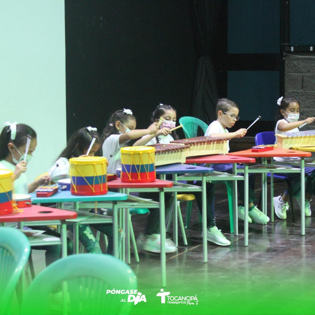 Dieciocho niños y niñas que hacen parte de este proceso en la Escuela de Formación Artística de Tocancipá desarrollaron el pasado lunes, la primera muestra del trabajo de exploración musical en el auditorio de la Casa de la Cultura. Los niños y niñas interpretaron instrumentos como el Xilófono, los tambores y las panderetas que ayudan en el proceso del desarrollo psicomotor y estimulan el sentido rítmico en los futuros artistas.