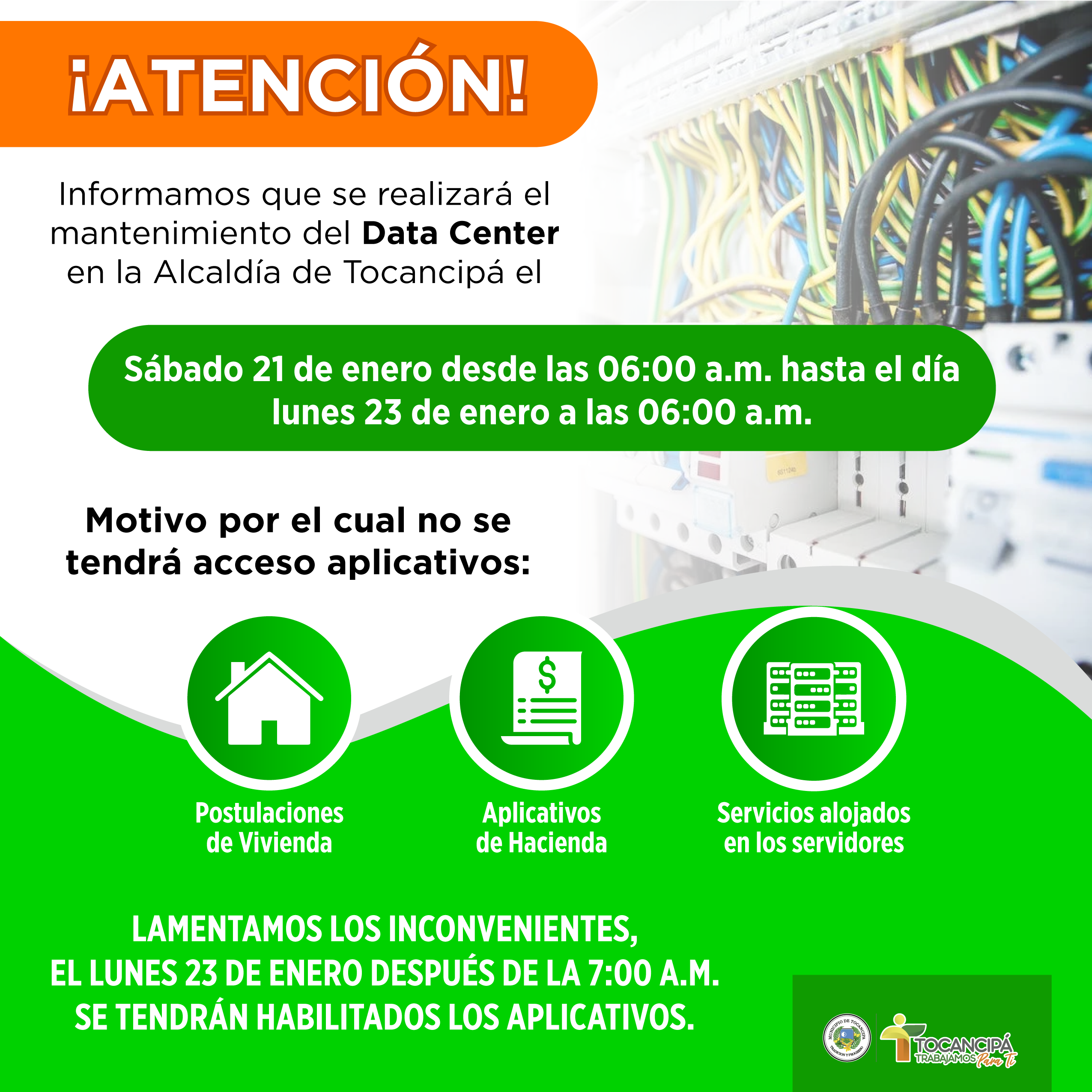 Informamos que se realizará el mantenimiento del Data Center en la Alcaldía de Tocancipá, el sábado 21 de enero desde las 06:00 a.m. hasta el día lunes 23 de enero a las 06:00 a.m.