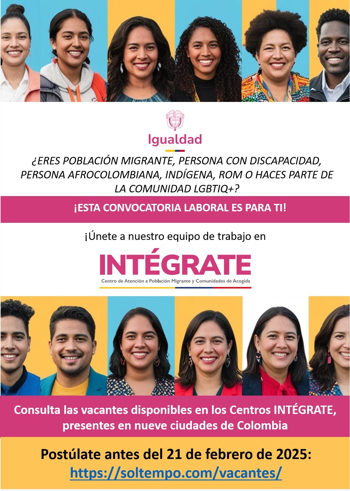 Convocatoria Laboral población migrante, discapacidad, afrocolombiana, indígena, rom o LGBTIQ