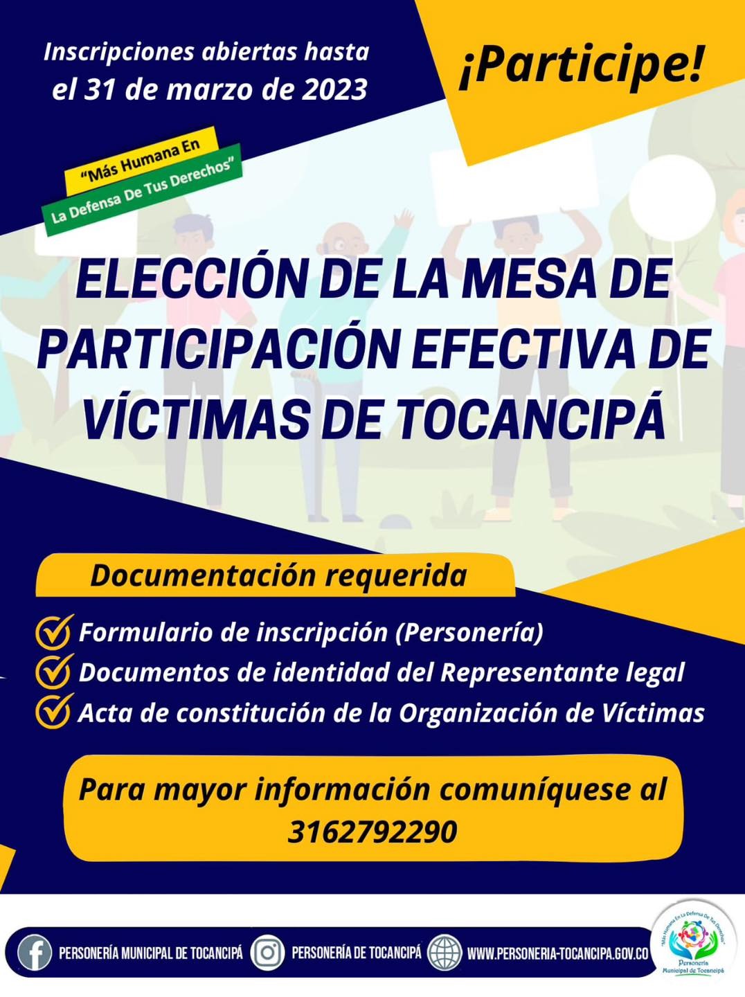 La Alcaldía Municipal de Tocancipá extiende la invitación de la Personería Municipal a las 𝙊𝙧𝙜𝙖𝙣𝙞𝙯𝙖𝙘𝙞𝙤𝙣𝙚𝙨 𝙙𝙚 𝙑𝙞́𝙘𝙩𝙞𝙢𝙖𝙨 (OV) a los 𝙎𝙪𝙟𝙚𝙩𝙤𝙨 𝙙𝙚 𝙍𝙚𝙥𝙖𝙧𝙖𝙘𝙞𝙤́𝙣 𝘾𝙤𝙡𝙚𝙘𝙩𝙞𝙫𝙖 y a las 𝙊𝙧𝙜𝙖𝙣𝙞𝙯𝙖𝙘𝙞𝙤𝙣𝙚𝙨 𝘿𝙚𝙛𝙚𝙣𝙨𝙤𝙧𝙖𝙨 𝙙𝙚 𝙑𝙞́𝙘𝙩𝙞𝙢𝙖𝙨 (ODV) residentes en el municipio, a participar de la inscripción y/o actualización de datos, para la elección y conformación de la Mesa de Participación Efectiva de Víctimas, periodo 2023- 2027.