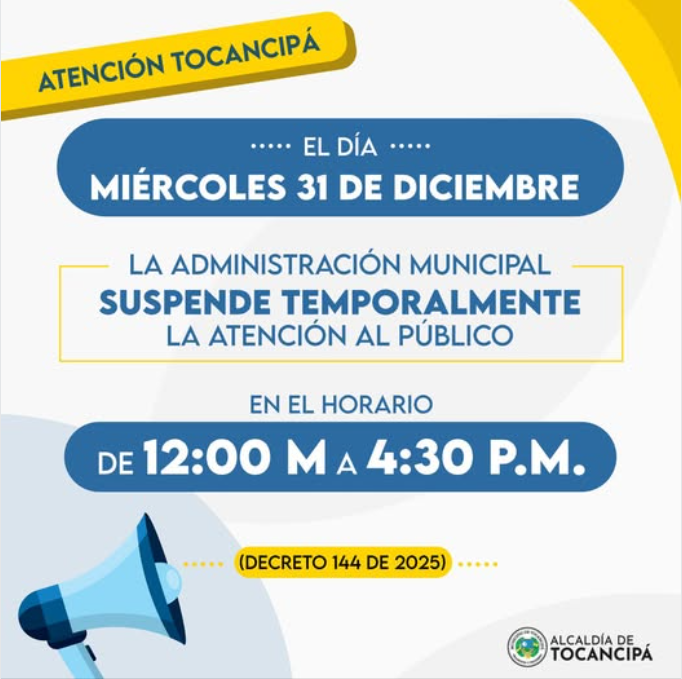 Informamos la ciudadanía, que de conformidad con el Decreto 144 de 2025, este miércoles 31 de diciembre, se suspende la atención al público en la Alcaldía de Tocancipá y en las demás sedes administrativas, lo anterior de 12:00 m. a las 4:30 p.m.