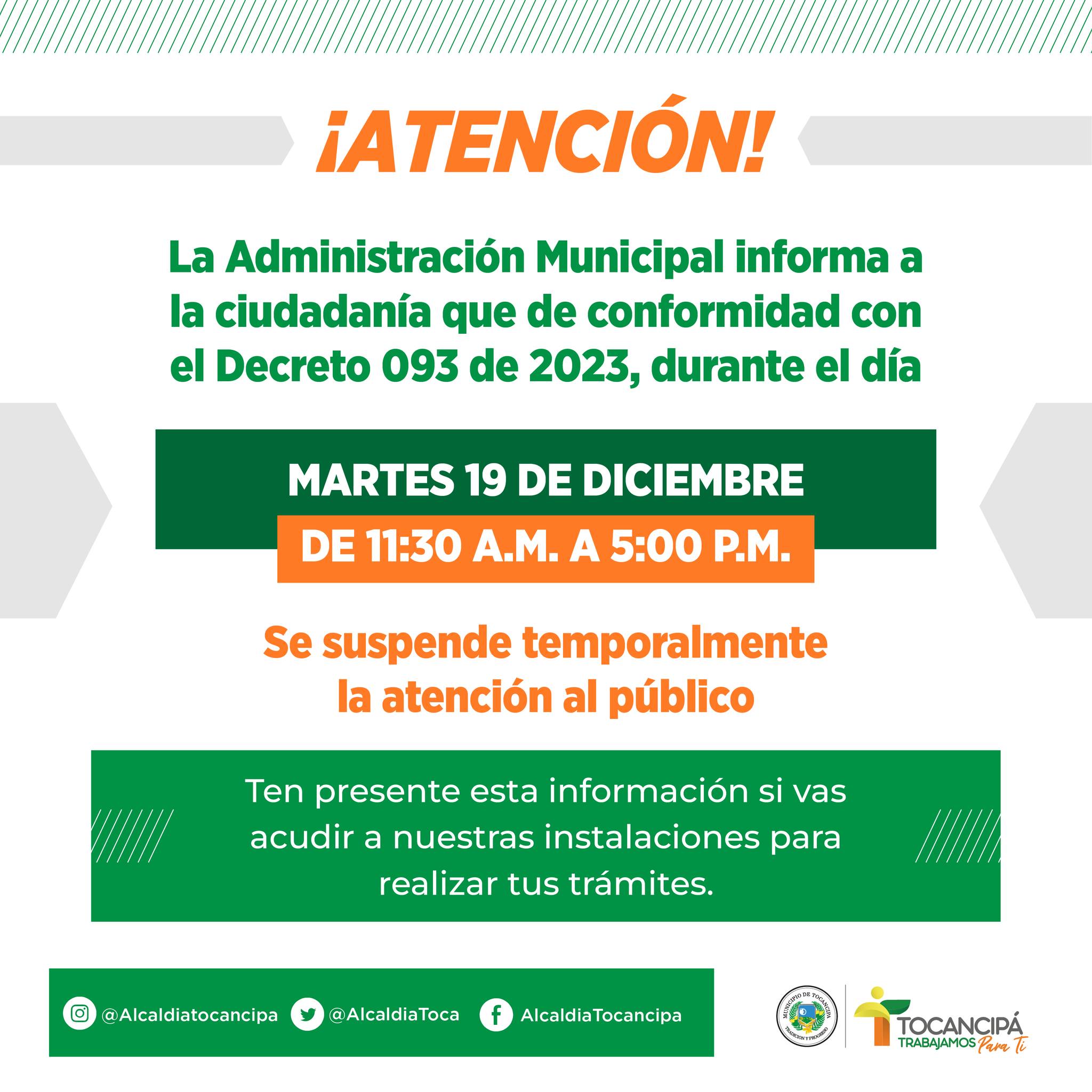 La Administración Municipal informa a la ciudadanía que, de conformidad al Decreto 093, durante el martes 19 de diciembre de 2023 de 11:30 a.m. a 5:00 p.m. no habrá atención al público.