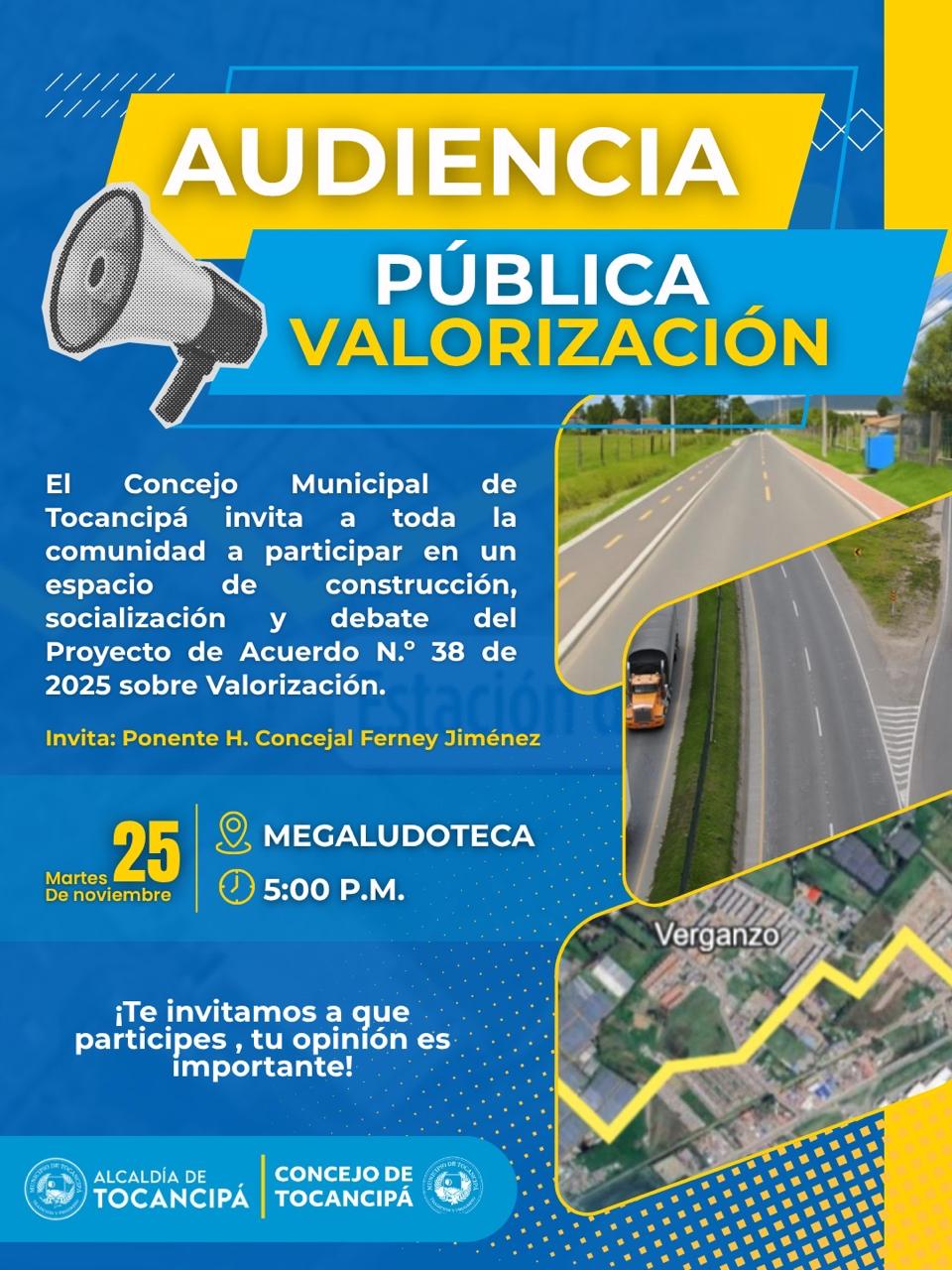 #TocancipáTeValoraConVíasParaElProgreso | El Concejo Municipal de Tocancipá y la Alcaldía de Tocancipá invitan a toda la comunidad a un espacio de participación ciudadana para la socialización y debate del Proyecto de Acuerdo N.º 38 de 2025 sobre la contribución especial de inversión en Valorización.
