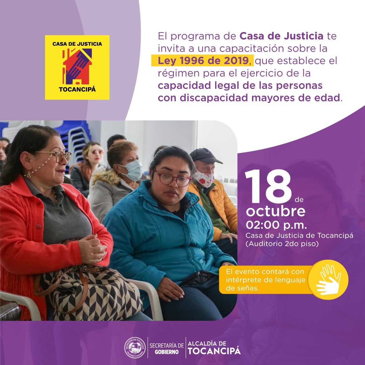 Desde de nuestro programa Casa de Justicia en #Tocancipá, invitamos a la capacitación sobre la Ley 1996 de 2019, que establece el régimen para el ejercicio de la capacidad legal de las personas con discapacidad, mayores de edad. Una jornada que llevaremos a cabo así: