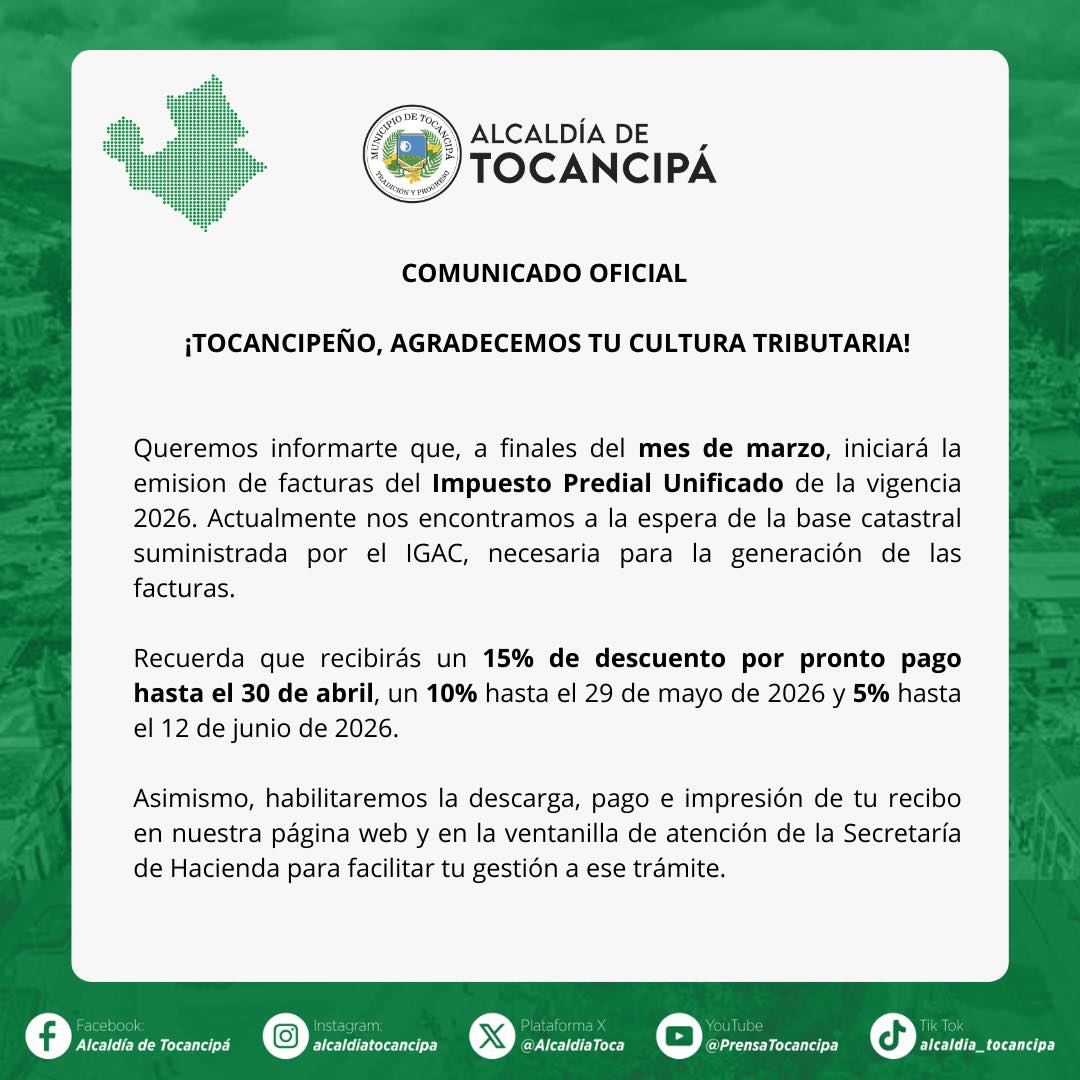 Tocancipeño te informamos que a finales de marzo iniciará la emisión de facturas del Impuesto Predial Unificado vigencia 2026. Actualmente estamos a la espera de la base catastral suministrada por el IGAC, necesaria para la generación de las facturas.