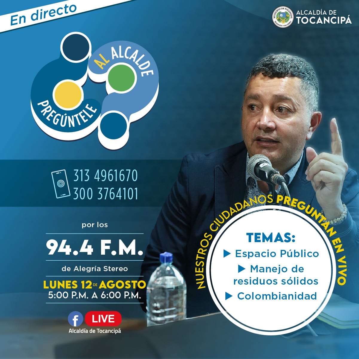 Este lunes 12 de agosto tendremos una nueva emisión del programa radial “Pregúntele al Alcalde”. Conéctese a través de los 94.4 FM emisora Alegría Estéreo, y en la transmisiónEn Vivo a través del Facebook de la Alcaldía, a partir de las 5:00 p.m. y haga sus preguntas sobre los siguientes temas: Espacio Público