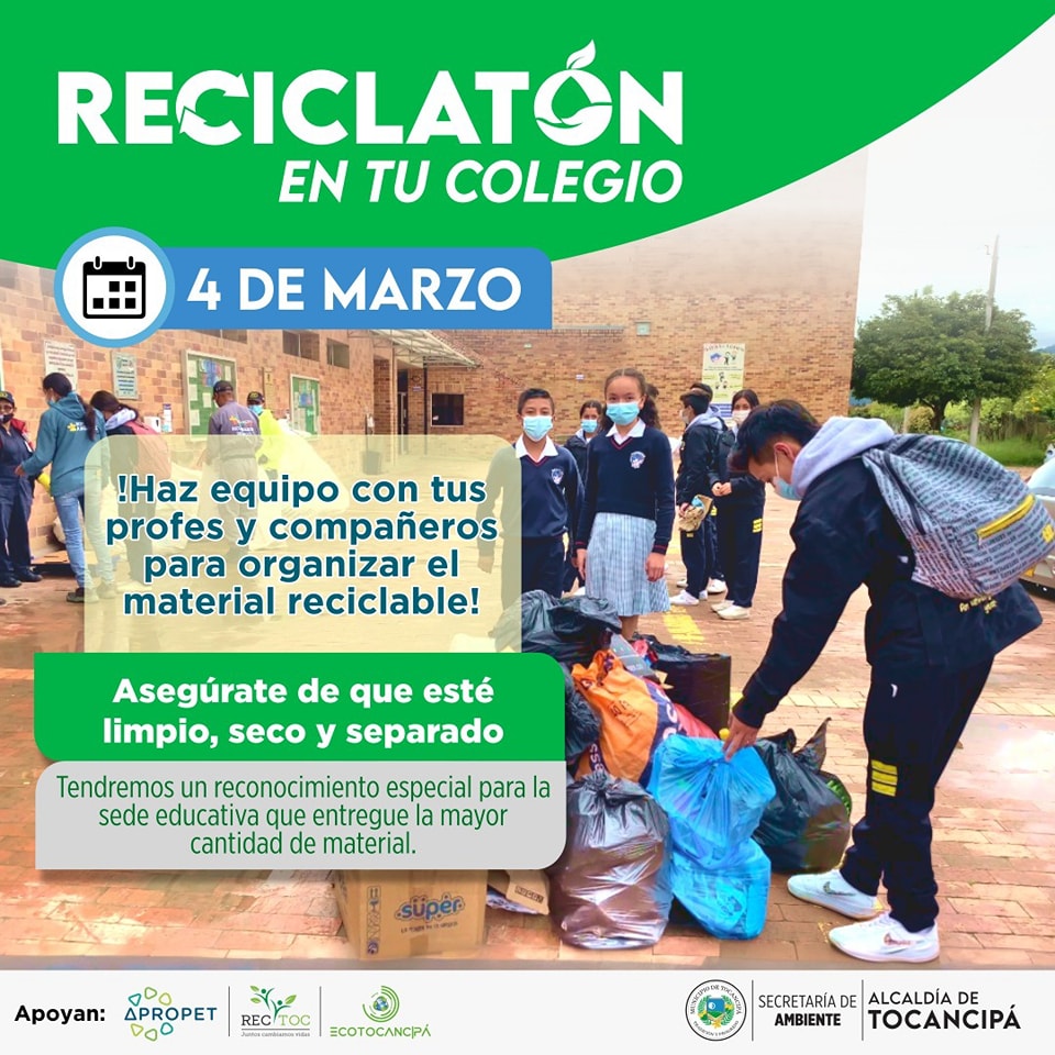 #Reciclaje | La Alcaldía de Tocancipá, a través de la Secretaría de Ambiente, los invitan a prepararse para la primera Reciclatón en tu colegio.
