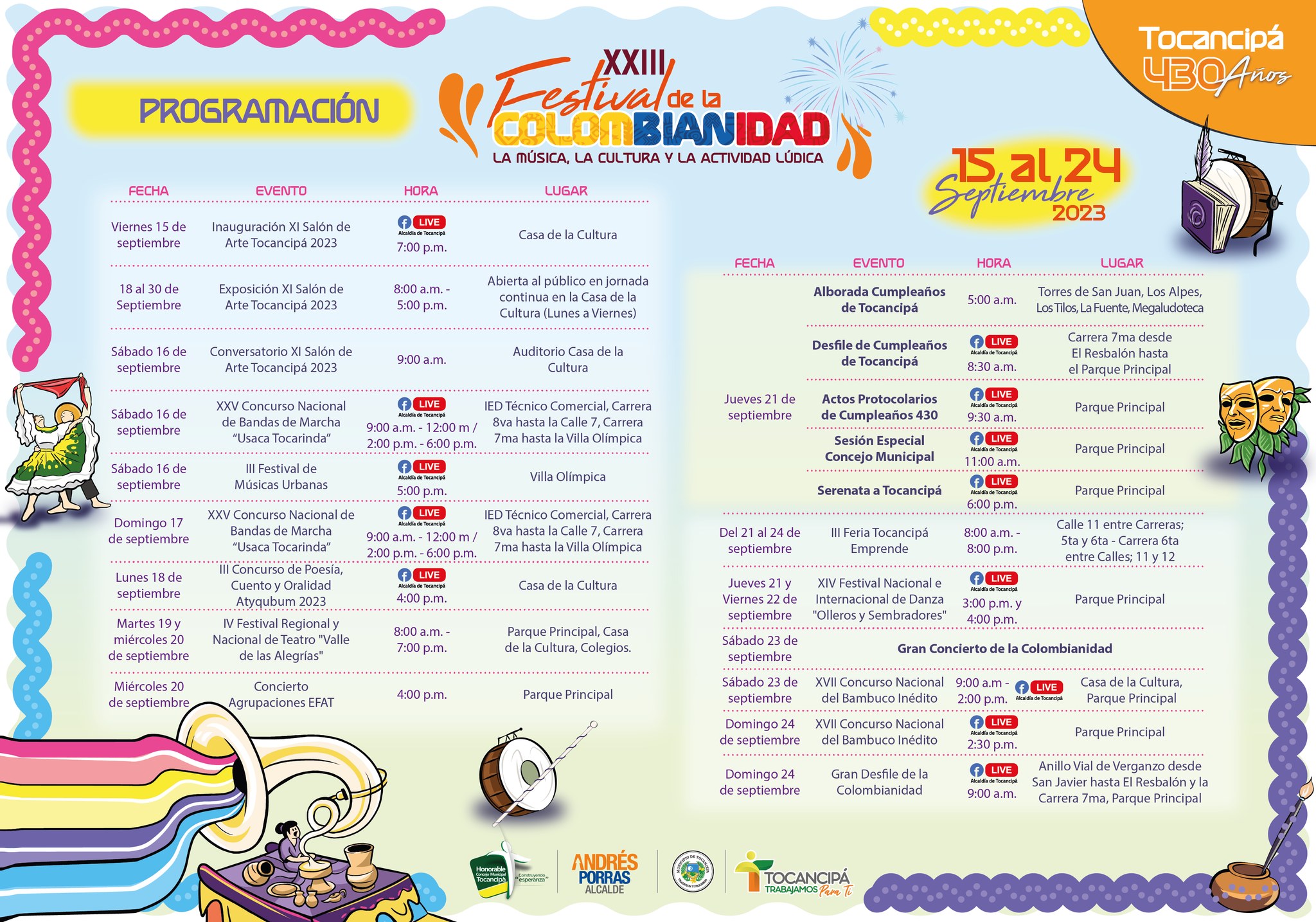 Sabemos que no se quieren perder ni un instante del Festival de la Colombianidad, por eso les presentamos el cronograma de principio a fin para que vivan la cultura en Tocancipá del 15 al 24 de septiembre.