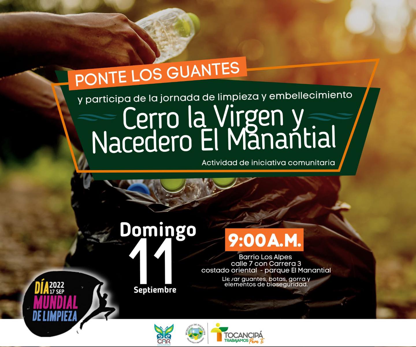 Nuestra Secretaría de Ambiente en articulación con la Secretaría de Ambiente y cómo iniciativa comunitaria te invitan a ponerte los guantes y participar en la jornada de limpieza y embellecimiento en el Cerro La Virgen y el nacedero El Manantial.