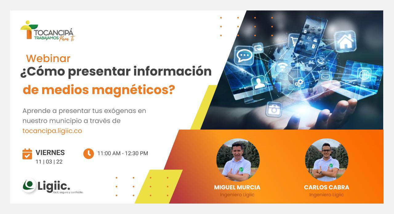 Aprende a presentar la información exógena tributaria de empresas en Tocancipá, a través de tocancipa.ligii.co en el webinar ¿𝐂𝐨́𝐦𝐨 𝐩𝐫𝐞𝐬𝐞𝐧𝐭𝐚𝐫 𝐢𝐧𝐟𝐨𝐫𝐦𝐚𝐜𝐢𝐨́𝐧 𝐝𝐞 𝐦𝐞𝐝𝐢𝐨𝐬 𝐦𝐚𝐠𝐧𝐞́𝐭𝐢𝐜𝐨𝐬?