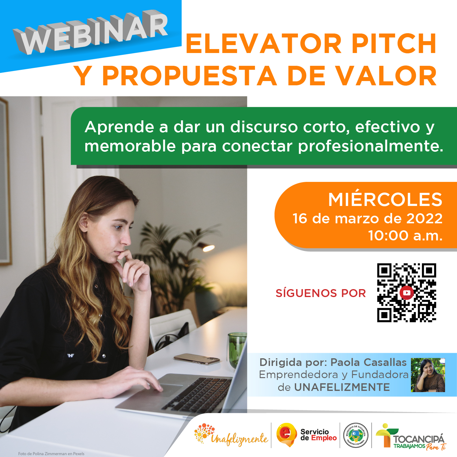 La Agencia Pública de Empleo de Tocancipá en colaboración con la empresa Una Feliz Mente invita a los profesionales y buscadores de empleo en general a participar del 𝗪𝗲𝗯𝗶𝗻𝗮𝗿 𝗘𝗹𝗲𝘃𝗮𝘁𝗼𝗿 𝗣𝗶𝘁𝗰𝗵 𝘆 𝗣𝗿𝗼𝗽𝘂𝗲𝘀𝘁𝗮 𝗱𝗲 𝗩𝗮𝗹𝗼𝗿.