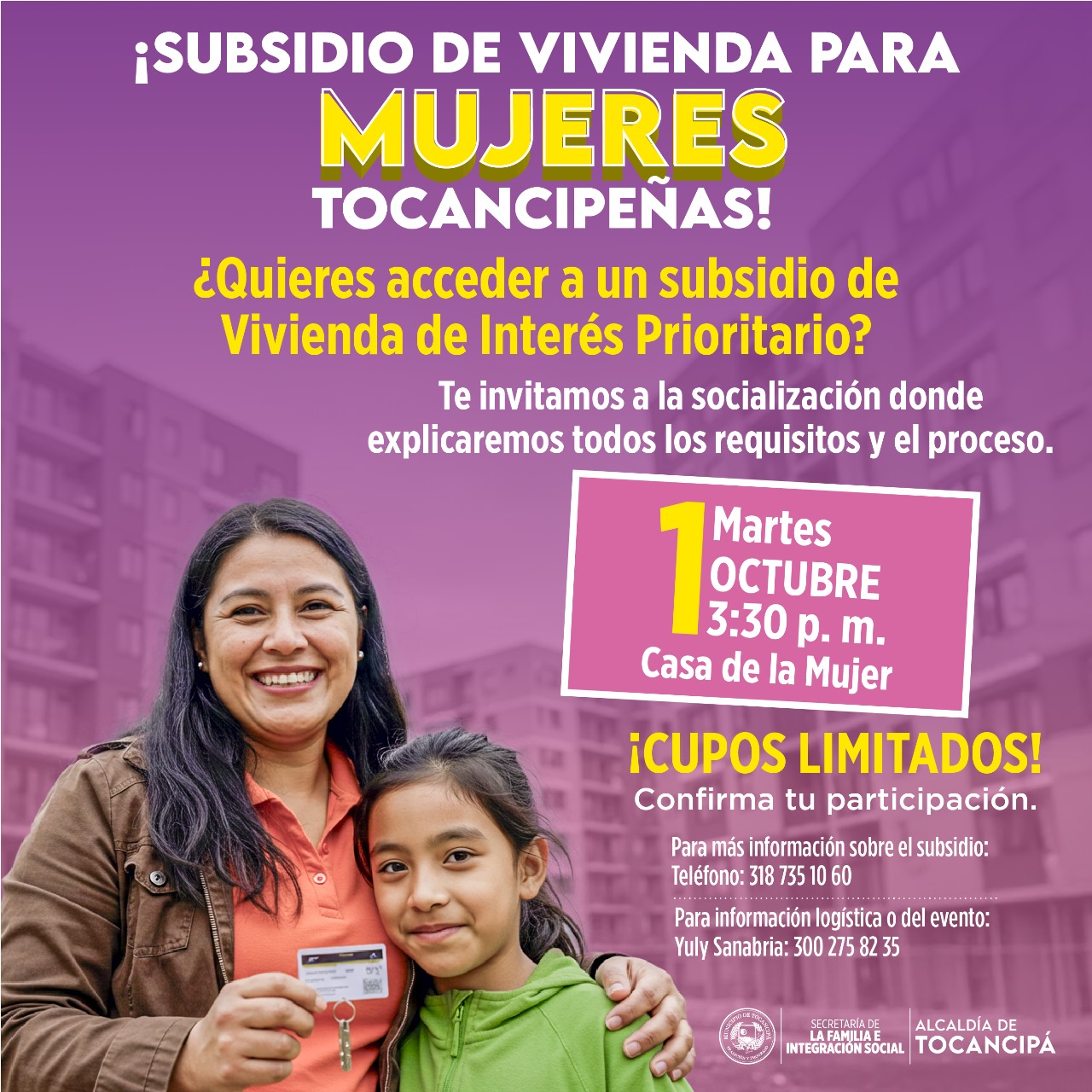 La Alcaldía de Tocancipá invita a todas las mujeres del municipio a participar en la socialización del Subsidio de Vivienda de Interés Prioritario (VIP), un programa diseñado para facilitar el acceso a vivienda propia.
