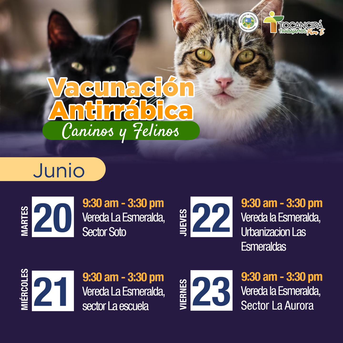 ¡Tocancipeñ@s! Prográmate la próxima semana para la 𝗖𝗮𝗺𝗽𝗮𝗻̃𝗮 𝗱𝗲 𝗩𝗮𝗰𝘂𝗻𝗮𝗰𝗶𝗼́𝗻 𝗔𝗻𝘁𝗶𝗿𝗿𝗮́𝗯𝗶𝗰𝗮 𝗖𝗮𝗻𝗶𝗻𝗼𝘀 𝘆 𝗙𝗲𝗹𝗶𝗻𝗼𝘀.