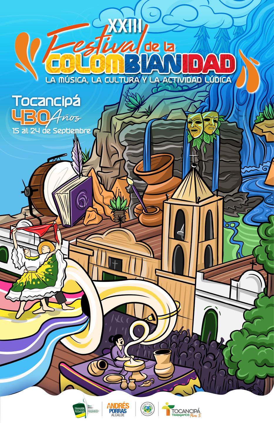 Les presentamos la imagen oficial del Festival, una propuesta gráfica realizada por Brandon Chaná, diseñador tocancipeño quien participó y ganó el Portafolio de Estímulos 2023. Nos llena de alegría saber que por segundo año consecutivo, la imagen de la Colombianidad está en la creatividad de los tocancipeños.