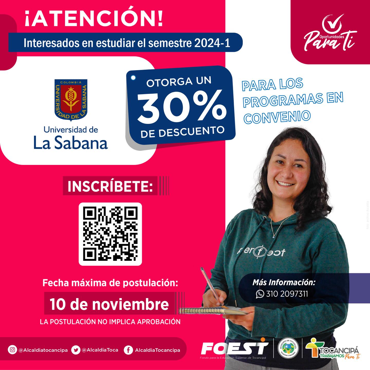 Aplicando a esta convocatoria podrás recibir un 30% de descuento para el pago de la matrícula, si eres estudiante nuevo de la Universidad de la Sabana en alguno de los programas en convenio.
