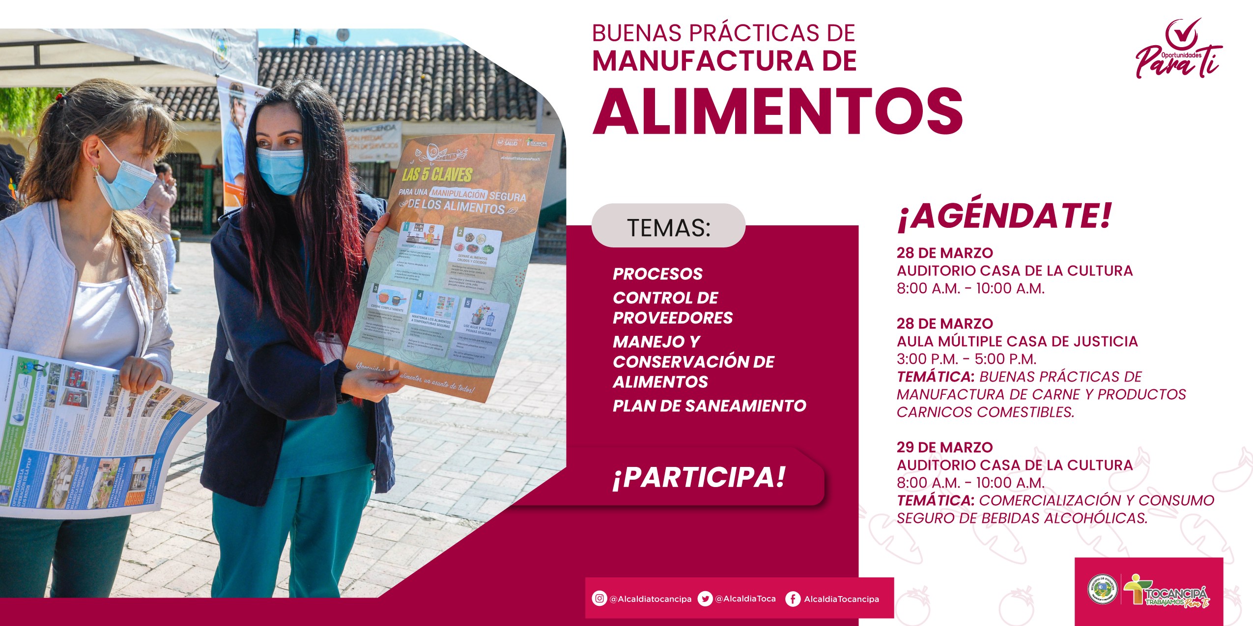 Nuestra Secretaría de Salud, como parte de las estrategias de Información y Educación para la Salud, invita a la comunidad en general y en especial a las personas que manipulan alimentos y bebidas para consumo humano al espacio de capacitación para afianzamiento de competencias en Buenas Prácticas de Manufactura.