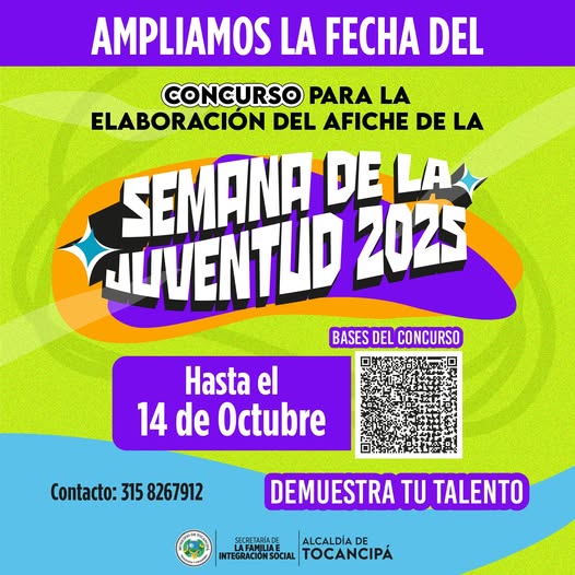 Deberás diseñar el afiche que represente la Semana de la Juventud 2025, las indicaciones las encuentras en el siguiente link: https://www.tocancipa-cundinamarca.gov.co/.../concurso...