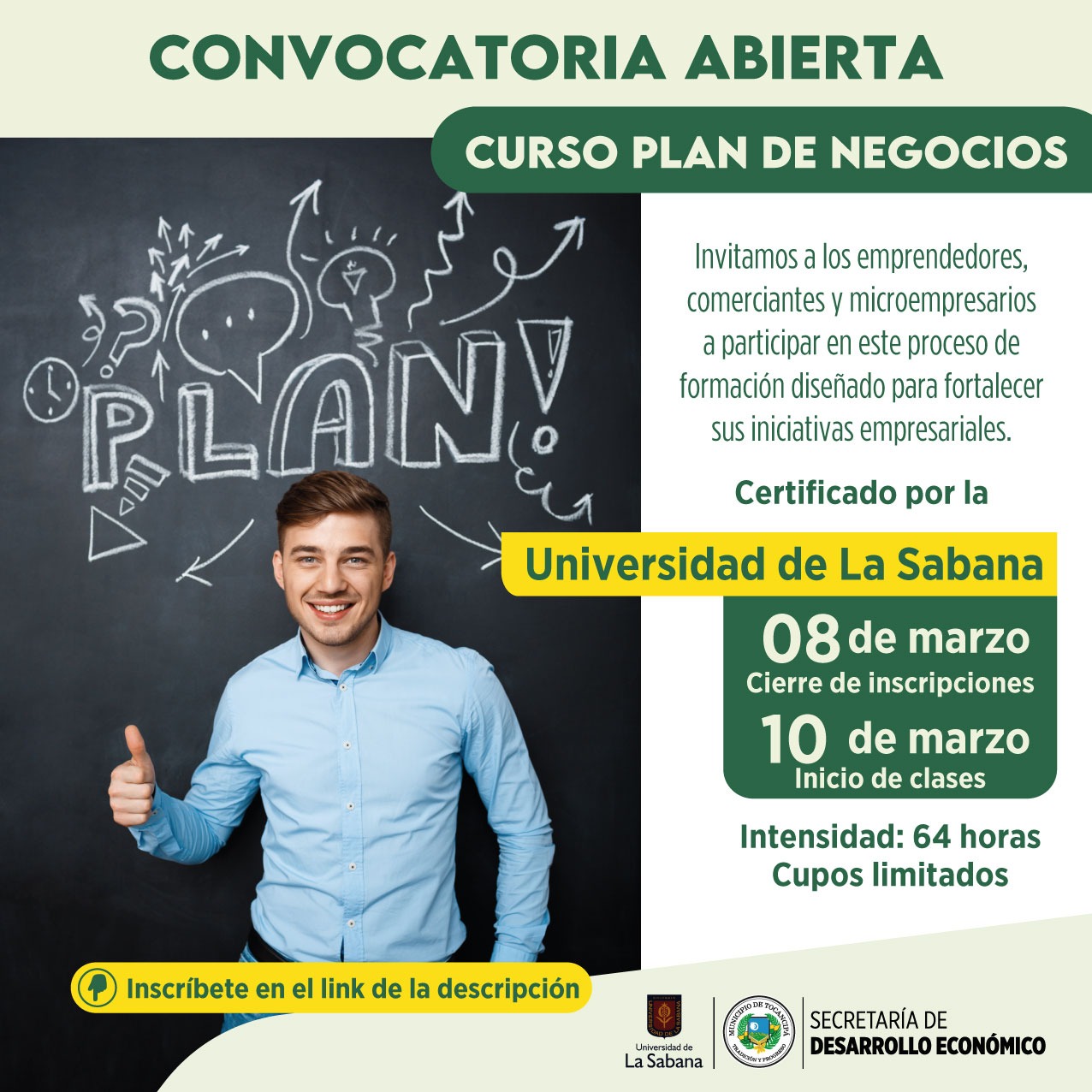 #Convocatoria | ¿Tienes un negocio en mente o quieres llevar el tuyo al siguiente nivel? La Secretaría de Desarrollo Económico de Tocancipá, en alianza con la Universidad de La Sabana, te invita a participar en el Curso de Plan de Negocios. Una oportunidad única para emprendedores y comerciantes de nuestro municipio.