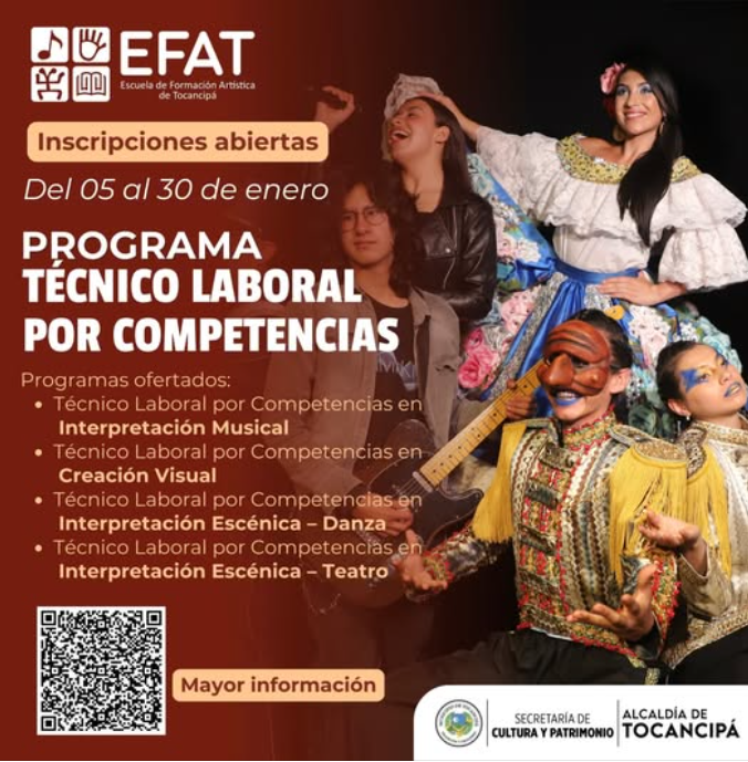 Impulsa tu talento, construye tu futuro y haz parte de la EFAT, un proceso formativo de la Secretaría de Cultura y Patrimonio con el respaldo de la Alcaldía de Tocancipá.