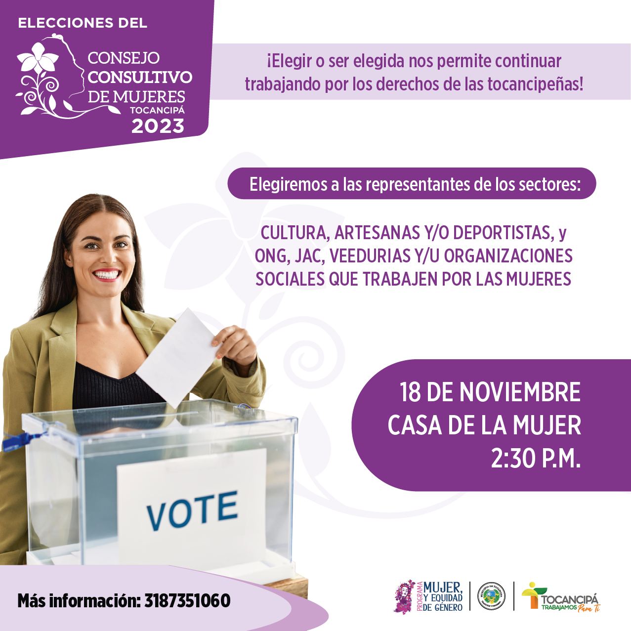 Elegir o ser elegida nos permite continuar trabajando juntas por los derechos de las mujeres del municipio. Participa en las Elecciones del Consejo Consultivo de Mujeres 2023.