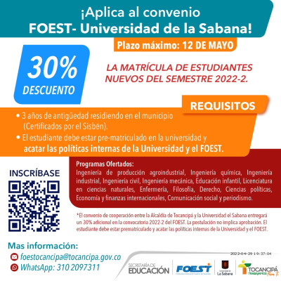 El convenio de Cooperación entre la Alcaldía de Tocancipá y la Universidad el Sabana entregará un 30% adicional en la convocatoria 2022-2 del FOEST.