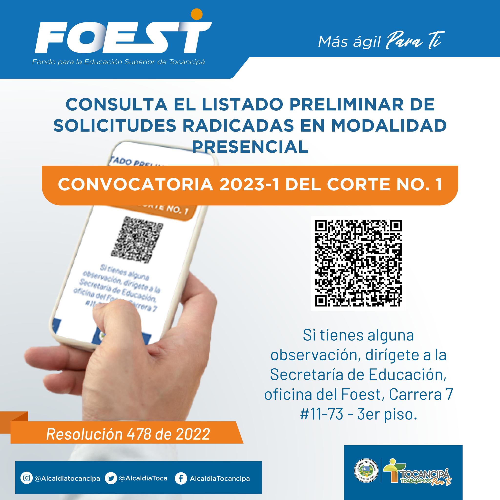 Si radicaste tus documentos de manera presencial para el Fondo para la Educación Superior de Tocancipá (Foest) en la convocatoria 2023-1 del corte No.1 consulta el siguiente listado: https://cutt.ly/X8XCmpv