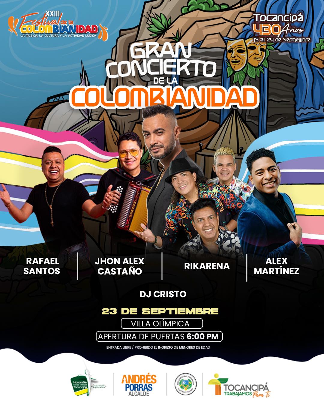 Vive el 𝗚𝗿𝗮𝗻 𝗖𝗼𝗻𝗰𝗶𝗲𝗿𝘁𝗼 𝗱𝗲 𝗹𝗮 𝗖𝗼𝗹𝗼𝗺𝗯𝗶𝗮𝗻𝗶𝗱𝗮𝗱 con los mejores artistas: Jhon Alex Castaño, Rafael Santos Diaz, Rikarena, Alex Martínez y la animación de Dj Cristo