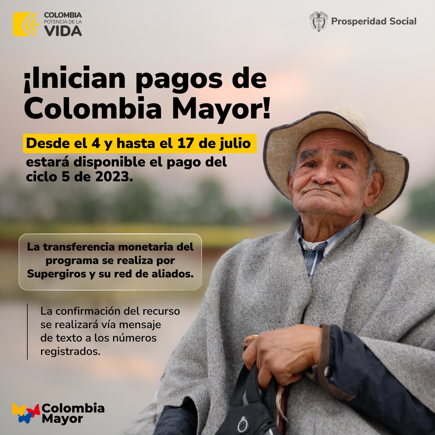 El programa Colombia Mayor informa a los beneficiarios que el pago de subsidios estará disponible para su cobro a partir del 4 de julio y estará disponible para su cobro hasta el próximo 17 de agosto de 2023.