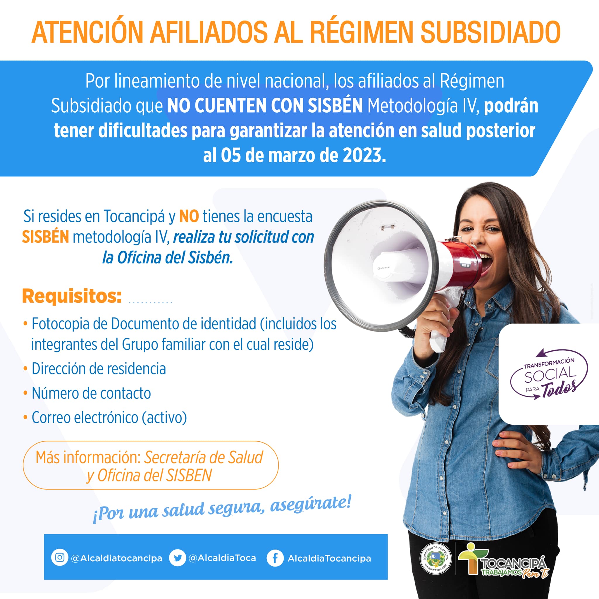 Invitamos a los afiliados del Régimen Subsidiado que no estén inscritos en el Sisbén IV