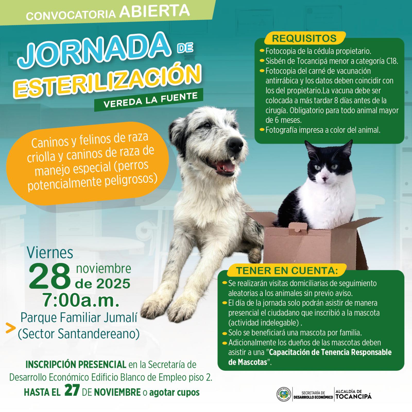 #BienestarAnimal | La Alcaldía de Tocancipá, a través de la Secretaría de Desarrollo Económico, realizará una nueva Jornada de Esterilización en La Fuente.
