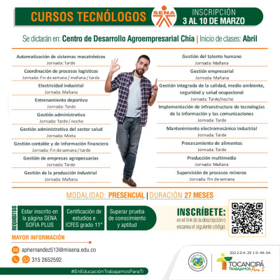 Desde hoy y hasta el 10 de marzo podrás inscribirte a los 17 cursos tecnológicos con el SENA, tienen una 𝙙𝙪𝙧𝙖𝙘𝙞𝙤́𝙣 𝙙𝙚 27 𝙢𝙚𝙨𝙚𝙨 y se dictaran de manera presencial en la sede del Centro de Desarrollo Agroempresarial de Chía.