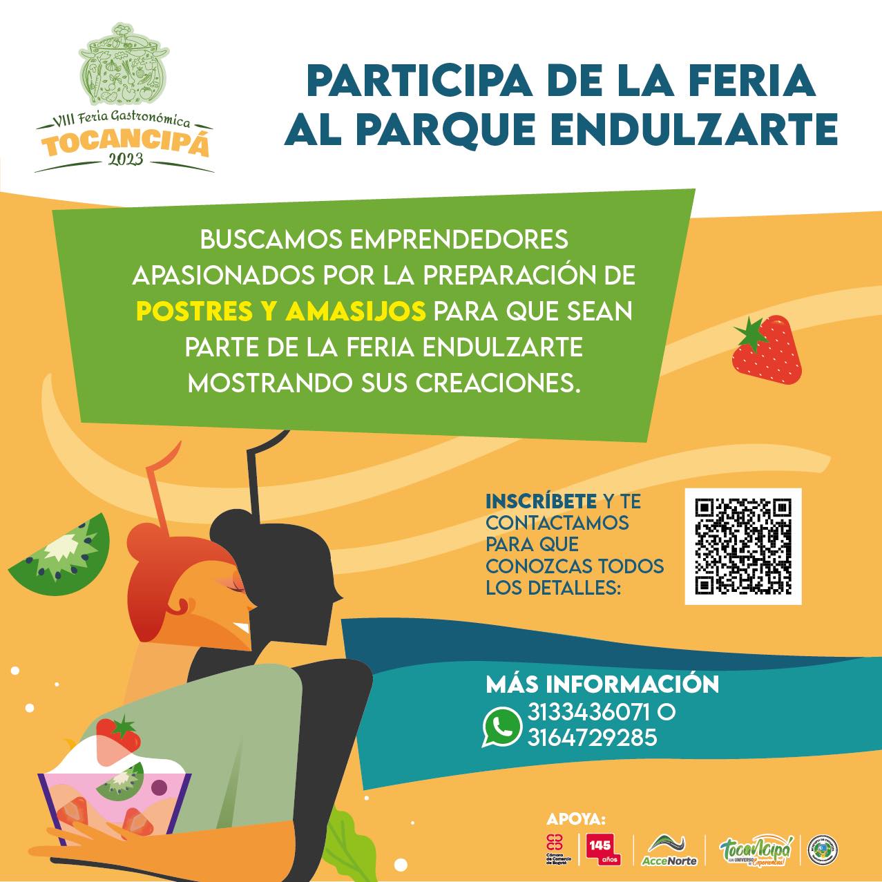 ¿Haces postres y amasijos? Te estamos buscando para que hagas parte de la Feria al Parque Endulzarte el 2 y 3 de diciembre en el marco de la octava Feria Gastronómica Tocancipá 2023.