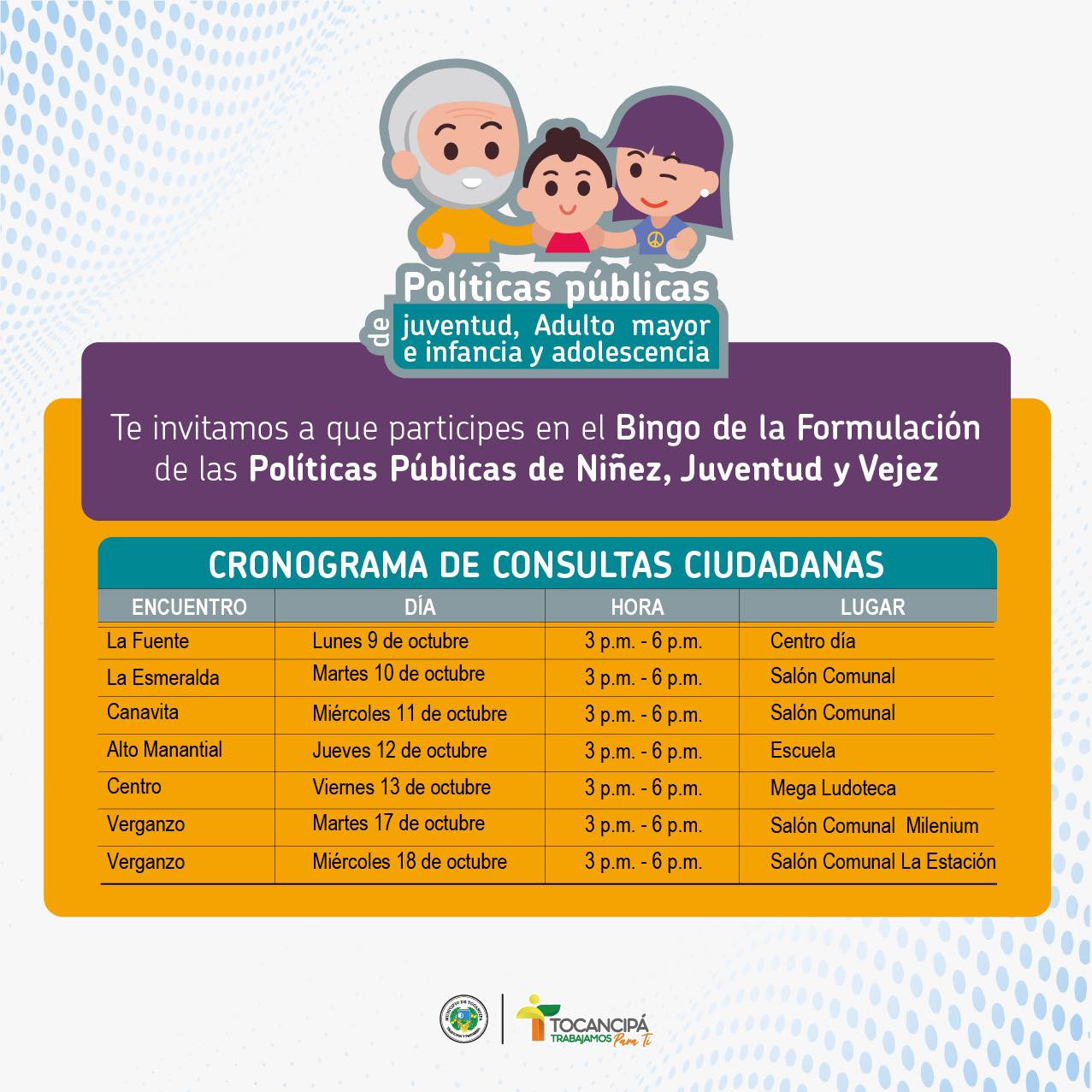 El Gobierno Municipal, Tocancipá Trabajamos Para Ti, tiene el gusto de invitar a toda la comunidad a participar en las mesas de trabajo para diagnóstico y formulación de las Políticas Públicas de Juventud, Adulto Mayor e Infancia y Adolescencia.