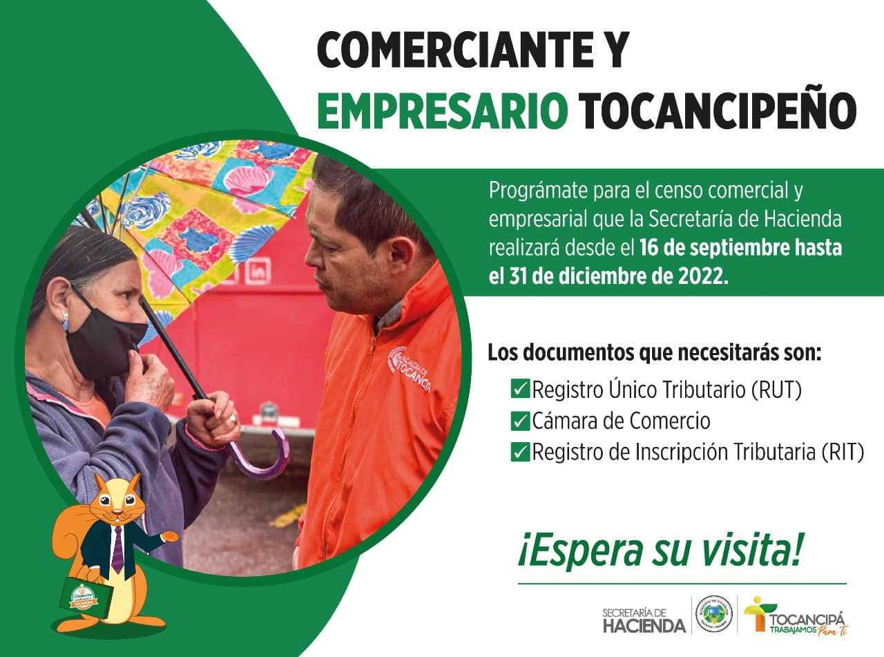 Con el propósito de actualizar la base de datos de los comerciantes y empresarios tocancipeños, la Secretaría de Hacienda estará visitando cada uno de los sectores de Tocancipá para realizar el censo comercial y empresarial, así que si tienes un establecimiento comercial, pequeña, mediana o gran empresa ¡Esperanos!
