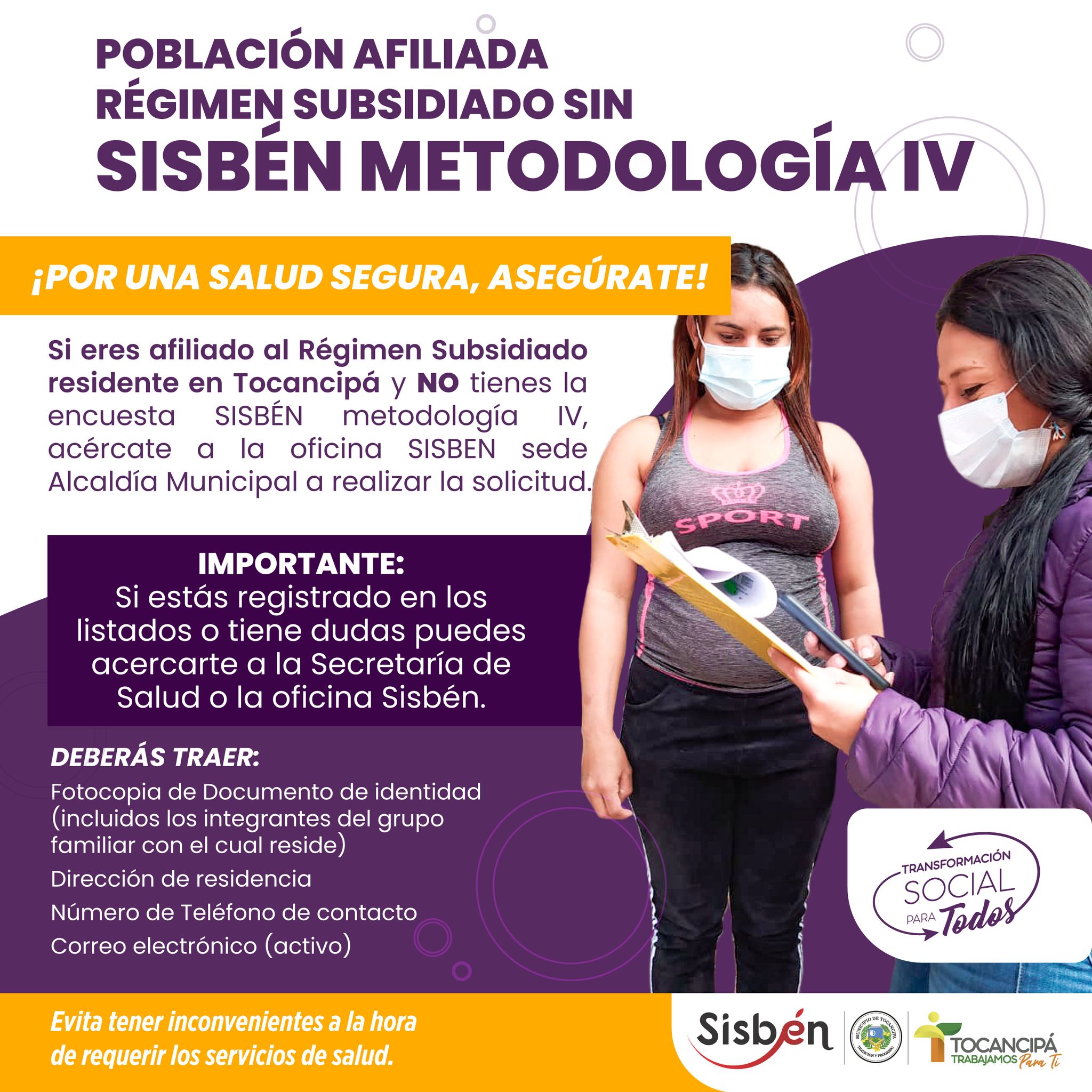 Invitamos a los afiliados del Régimen Subsidiado que no estén inscritos en el Sisbén IV del municipio a solicitar la encuesta en la Oficina del Sisbén