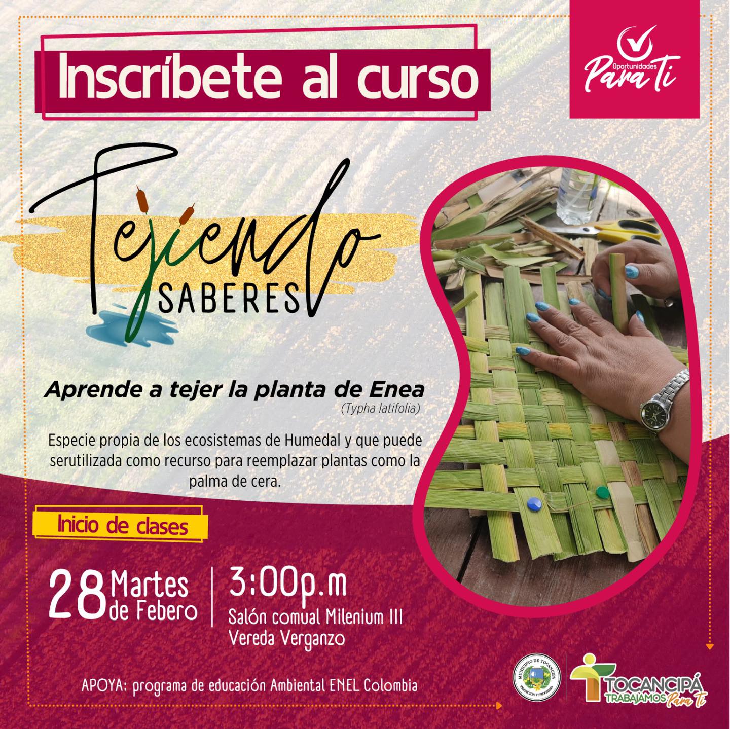 Aprende a tejer Enea con nuestra Secretaría de Ambiente Tocancipá. Las palmas silvestres de cera y vino son comercializadas ilegalmente para tejer ramos en la celebración religiosa de Semana Santa. Reemplacemos ese uso, generando beneficios al ecosistema, controlando el crecimiento y propagación con la planta Enea (Typha Latifolia).