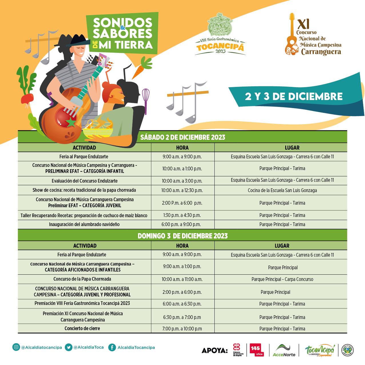 El próximo fin de semana: 2 y 3 de diciembre quédate en Tocancipá a disfrutar de Sonidos y Sabores de Mi Tierra, un evento que convoca a los amantes de la cocina en la #FeriaGastronómica2023 y lo mejor de la música carranguera en el Concurso Nacional de Música Campesina Carranguera.