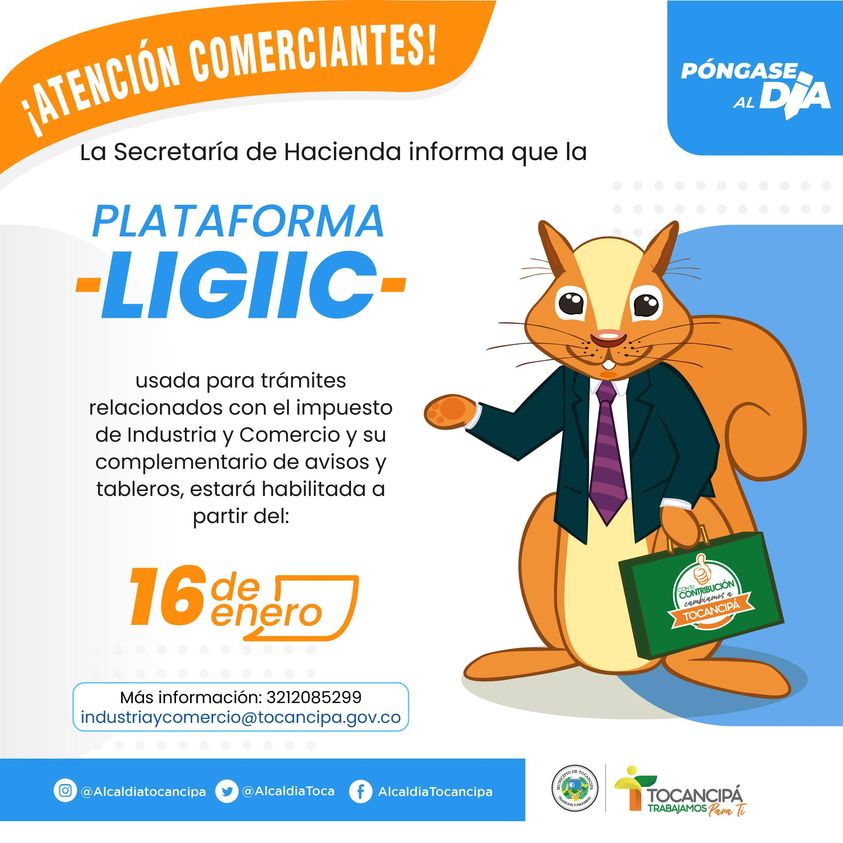 La Secretaría de Hacienda informa que la plataforma 𝐋𝐈𝐆𝐈𝐈𝐂 usada para trámites relacionados con el impuesto de Industria y Comercio y su complementario de avisos y tableros, estará habilitada a partir del: 𝟭𝟲 𝗱𝗲 𝗲𝗻𝗲𝗿𝗼 en la página web del municipio www.tocancipa.gov.co.