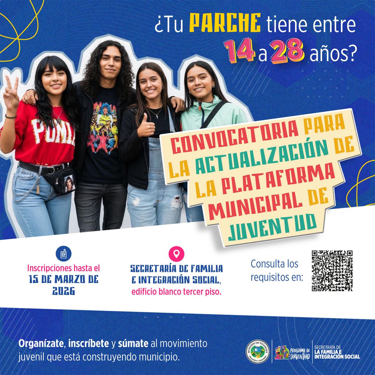 #Juventud | ¡Este espacio es para ti! Únete la Plataforma Municipal de Juventudes. Si tienes entre 14 y 28 años y haces parte de un parche que mueve ideas, lidera procesos o quiere generar cambios en el territorio, esta es tu oportunidad.