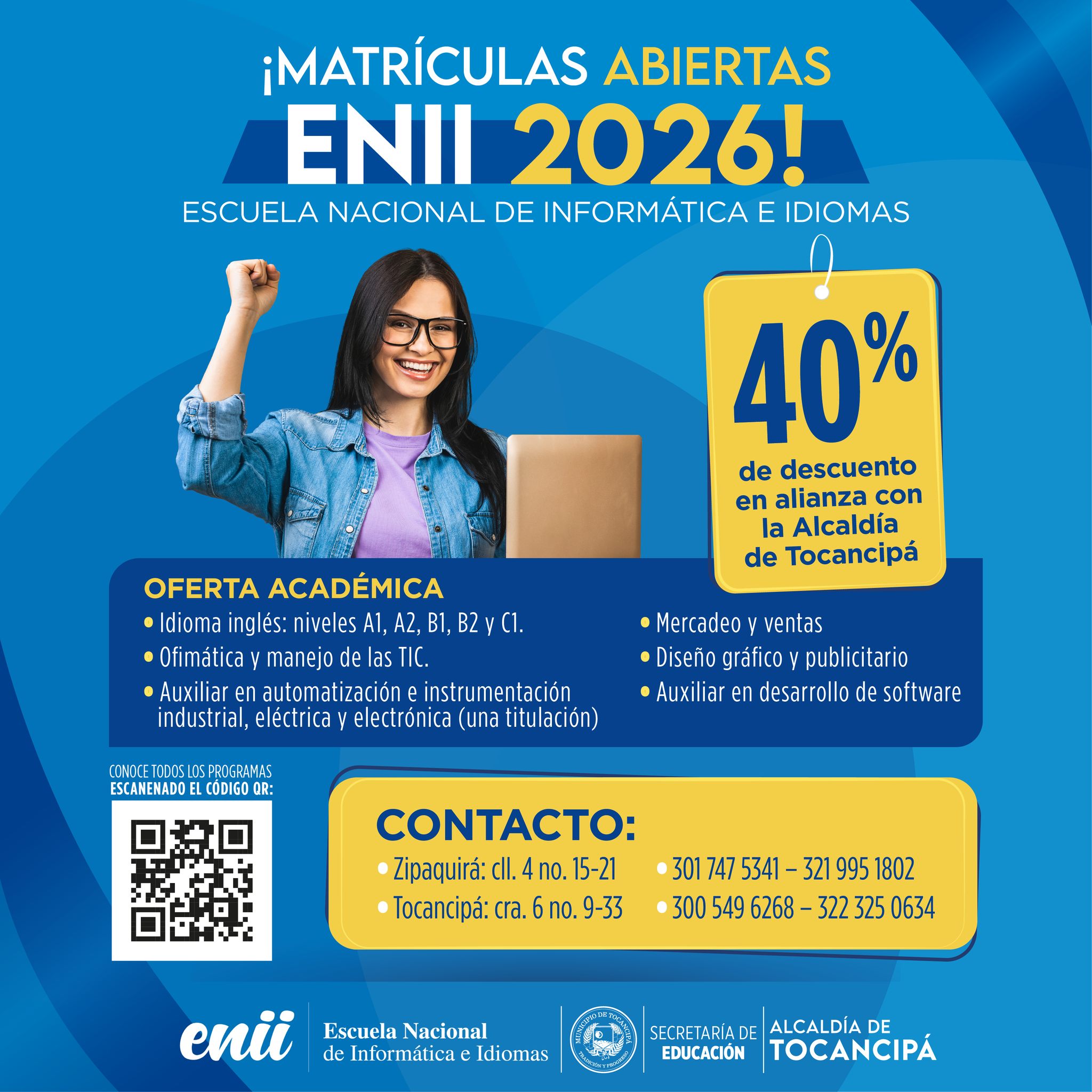 #ENII | La Escuela Nacional de Informática e Idiomas, en alianza con la Alcaldía de Tocancipá, ofrece 40% de descuento para que más tocancipeños accedan a educación de calidad. Es el momento de invertir en tu formación y abrir nuevas oportunidades laborales.