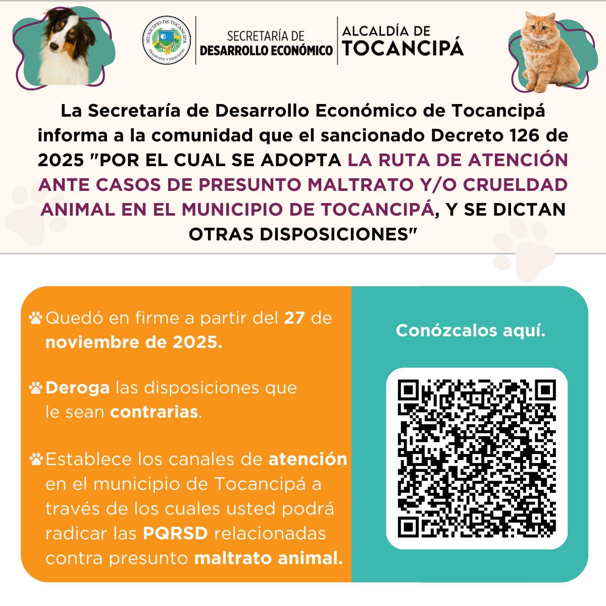 #Económico | Tocancipá adopta oficialmente el Decreto 126 de 2025, que establece la nueva Ruta de Atención para reportar casos de presunto maltrato y crueldad animal.