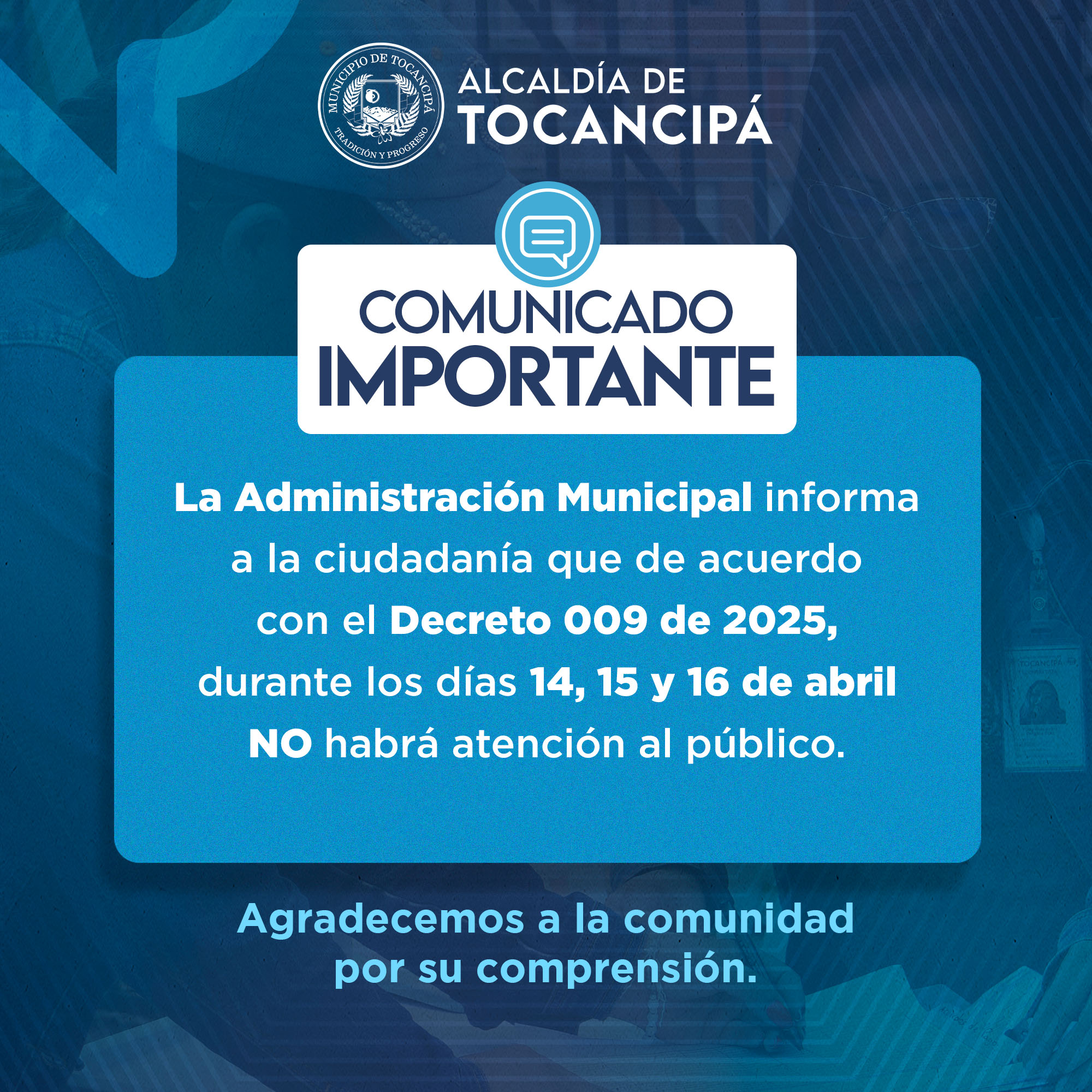 #InformaciónDeInterés | La Administración Municipal informa a la ciudadanía que de acuerdo con el Decreto 009 de 2025, durante los días 14, 15 y 16 de abril NO habrá atención al público.