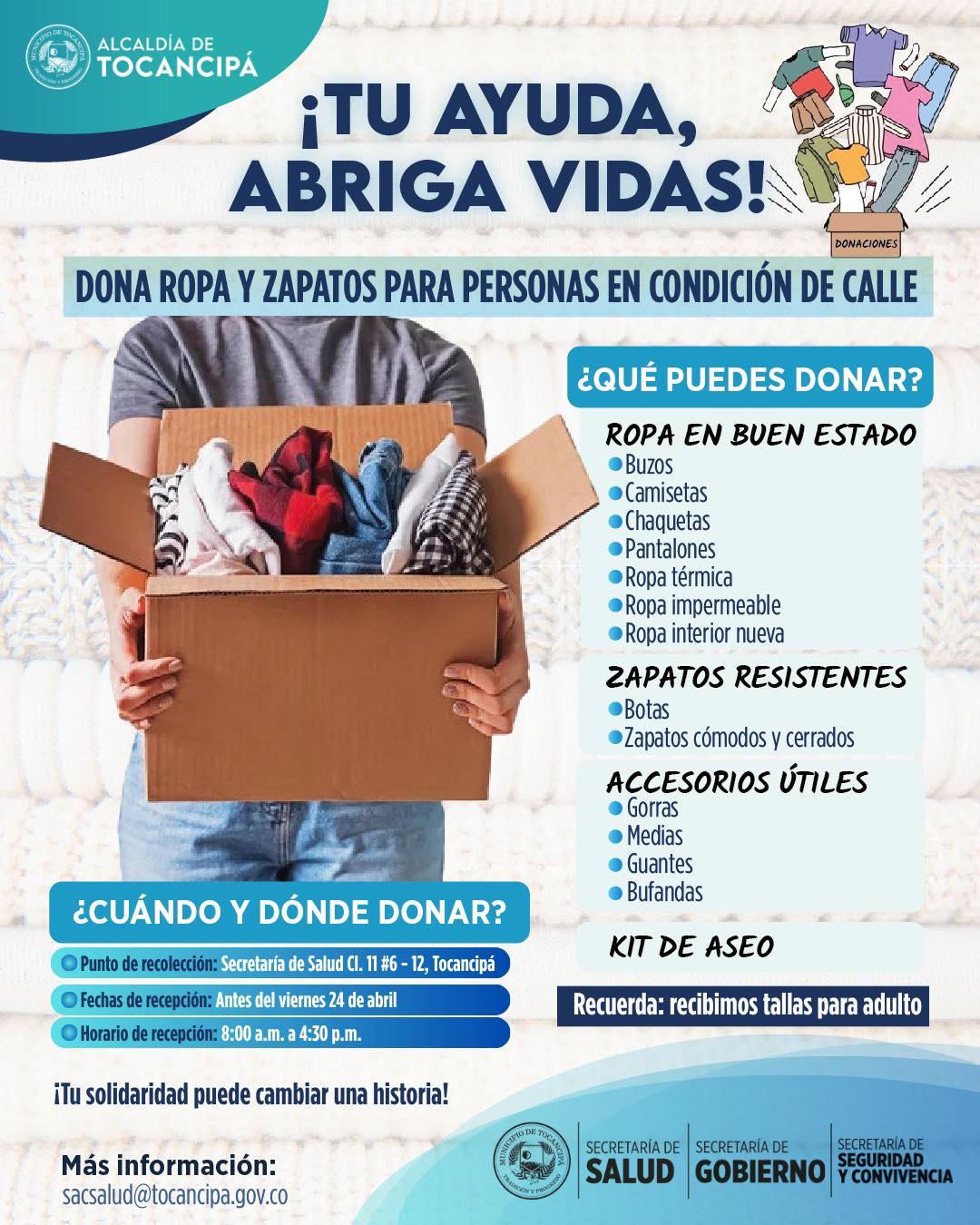 Recibiremos sus donaciones en la Alcaldía Municipal de 8:00 a.m. A 4:30 p.m. antes del viernes 24 de abril, día en que se realizará nuestra jornada de atención, donde tendremos feria de servicios y entrega de las donaciones.