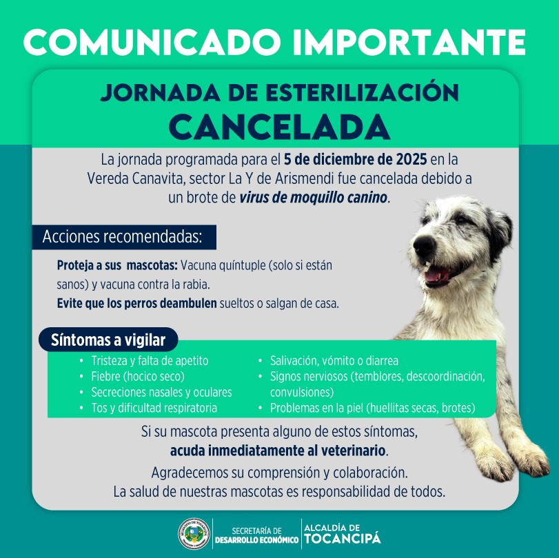 #Comunicado | La jornada de esterilización para mascotas caninas y felinas, programada para el 5 de diciembre en la Vereda Canavita fue CANCELADA por un brote de moquillo canino.