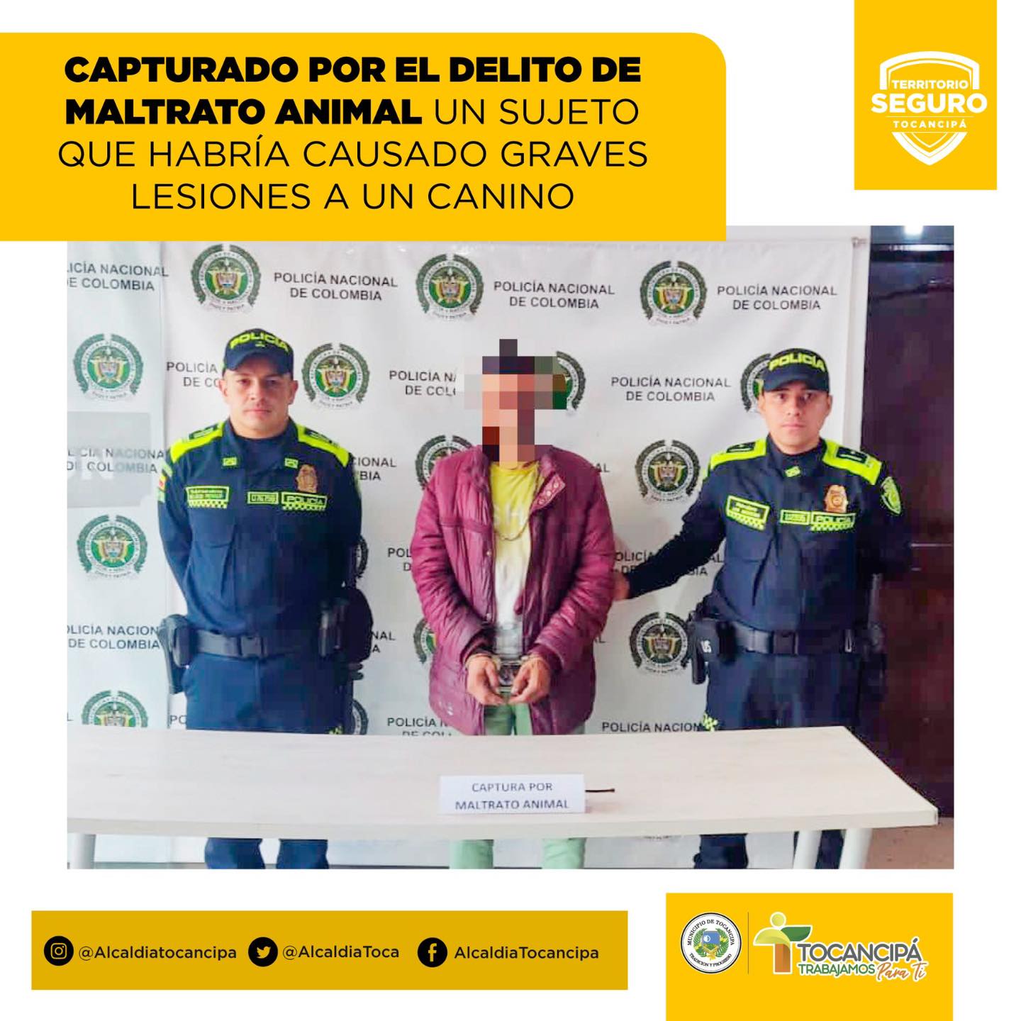 Atendiendo un llamado urgente de una ciudadana, uniformados de la Estación de Policía de Tocancipá capturaron en flagrancia a un sujeto por el presunto delito de maltrato animal.