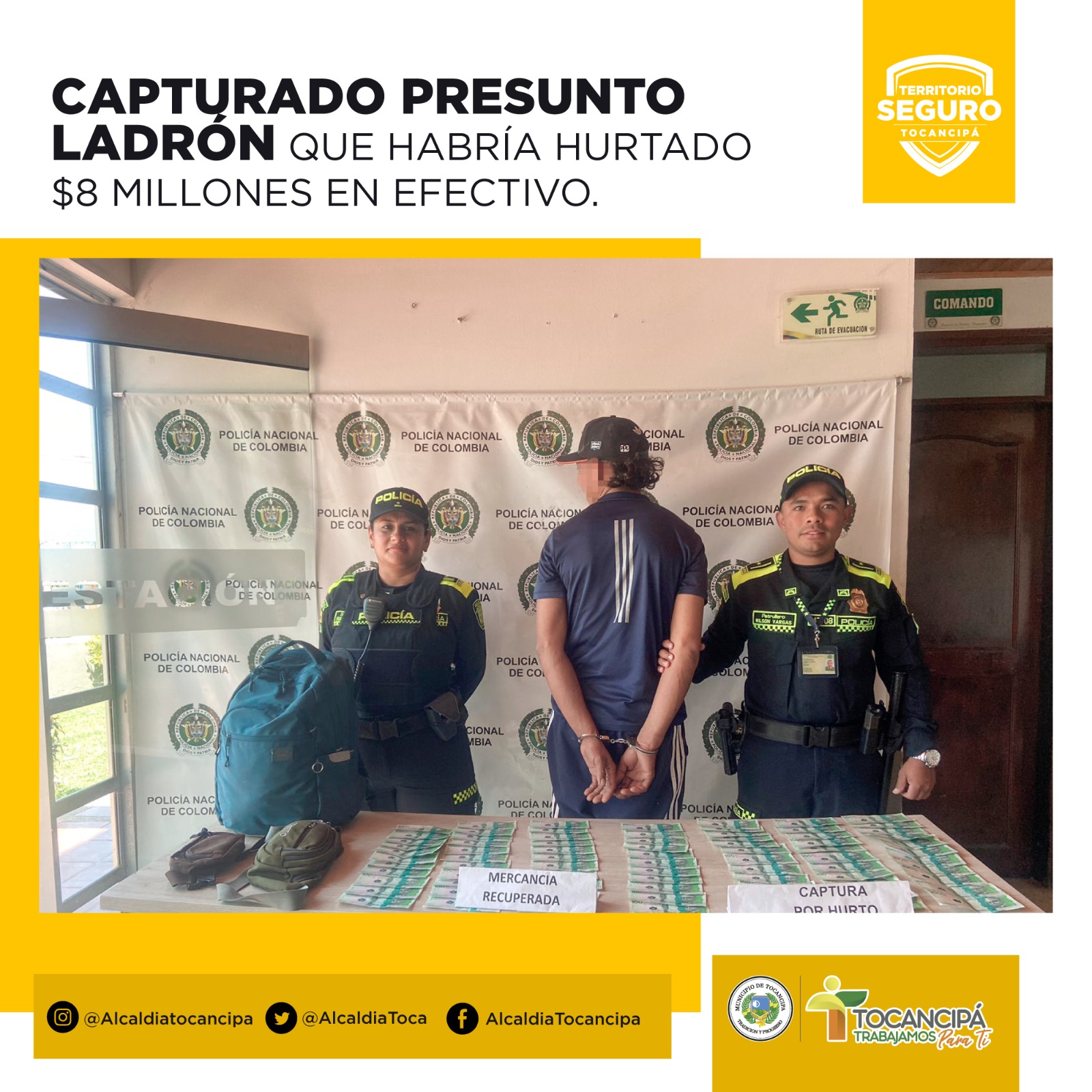 Efectivos de la Estación de Policía de Tocancipá, lograron la captura de un sujeto que minutos antes le habría hurtado a un ciudadano un morral con prendas personales y cerca de $8 millones en efectivo.