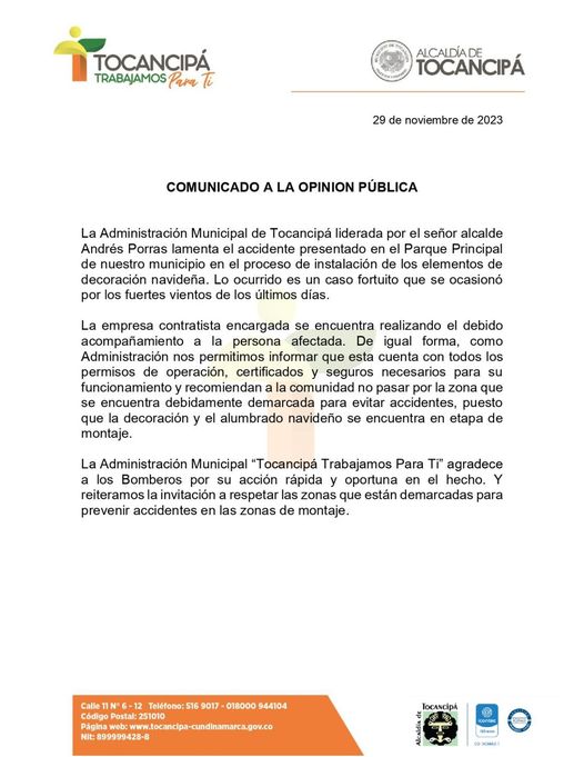Desde la Administración Municipal emitimos este importante comunicado a la opinión pública, en atención a los hechos ocurridos el 28 de noviembre en el Parque Principal del municipio.