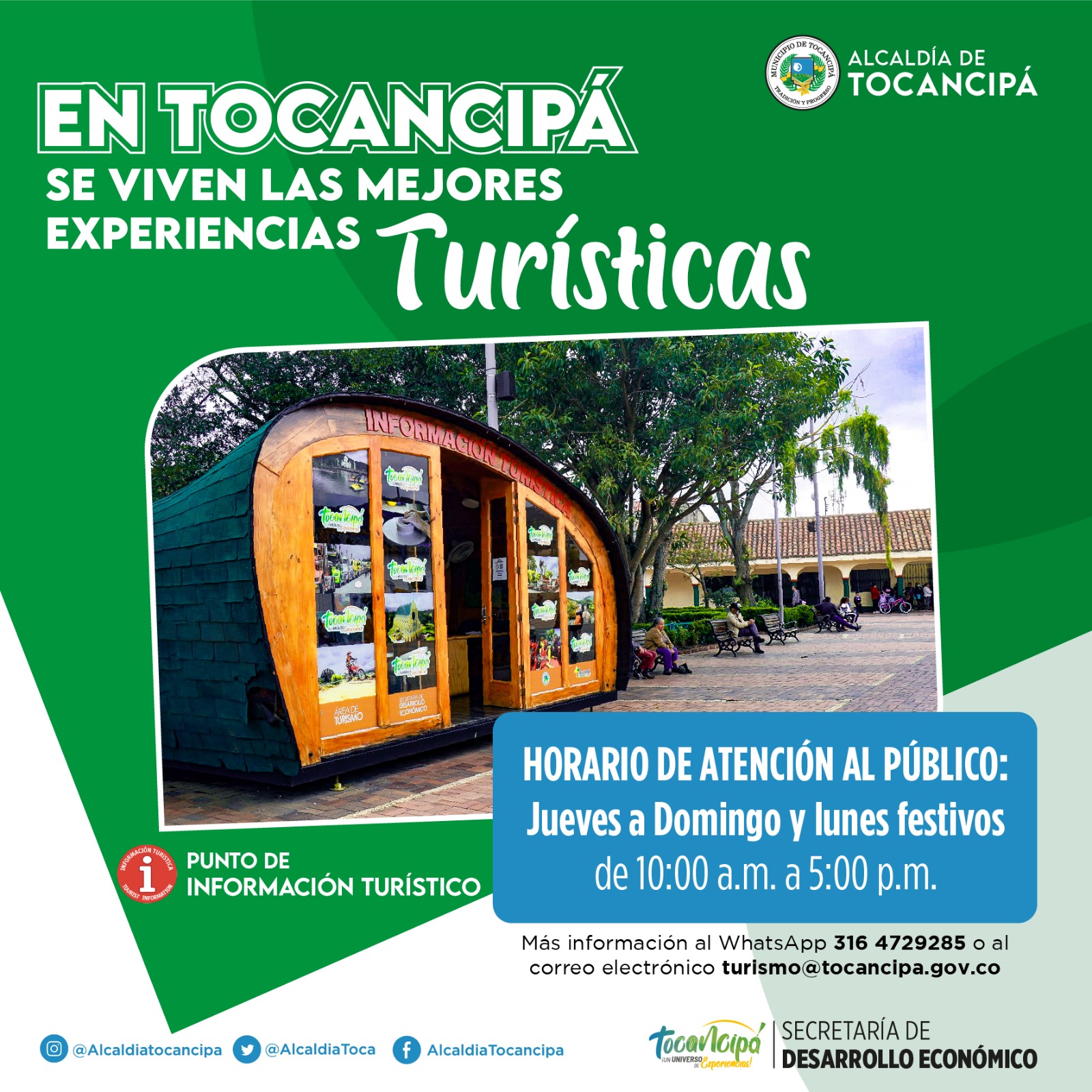 El Punto de Información Turística está disponible para todas las personas que deseen conocer Tocancipá. Allí encontrarás orientación sobre los principales puntos de interés y podrás descubrir la amplia oferta que el municipio tiene preparada para ti. Horarios de atención: jueves a domingo y lunes festivos de 10:00 a.m. – 5:00 p.m.
